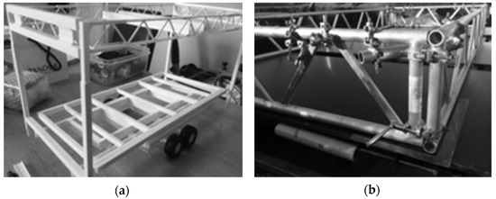 The first full-scale version was then constructed in line with the 3D model shown in Figure 11. The photographs in Figure 13 and Figure 14 show the fabricated physical components conceived in the prototype development process above. Figure 13 shows the base component, the flatbed trailer (a), and the tilting table (b).