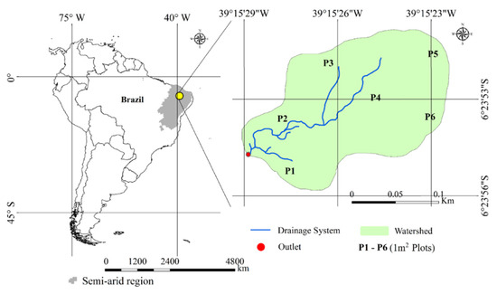 The study was developed in a catchment representative of a seasonally dry tropical forest in a semiarid environment. The historical mean annual rainfall of the region is 997 ± 300 mm, of which 89% is concentrated in the period from December to May [15]. The average potential evaporation is 2113 mm year-1, with an aridity index of 0.48 [16].