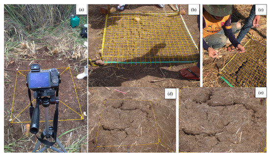 Based on the (0.05 m × 0.05 m) grid setup for each plot (Figure 2b) and a metric scale, we identified and measured crack characteristics (Figure 2c)–location, length, width and depth (Figure 2b,c). The measurements were taken with the aid of a caliper, a ruler, small vegetable rods and a laser distance meter. The volume of the cracks was evaluated assuming a parallelepiped form [20], being the product of the area of the crack by its depth (data available as Supplementary Materials).