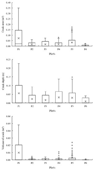 During the study period all cracks sealed superficially at some point (Figure 4), and a value of zero was attributed to the variables of area, depth and volume. The highest values of area, depth and volume were recorded in Plot P1, which is closer to outlet (Figure 1). Although Plot P1 did not have the highest clay content, it had the highest limit of plasticity, which directly influenced the expansion/contraction process, both in the magnitude of occurrence and in the speed of the processes [4,28] when compared with the other plots.