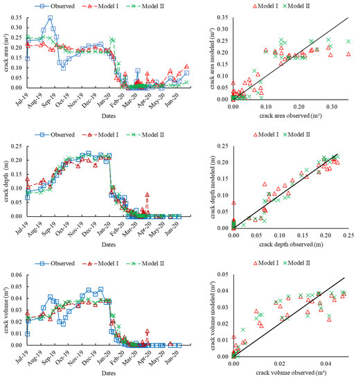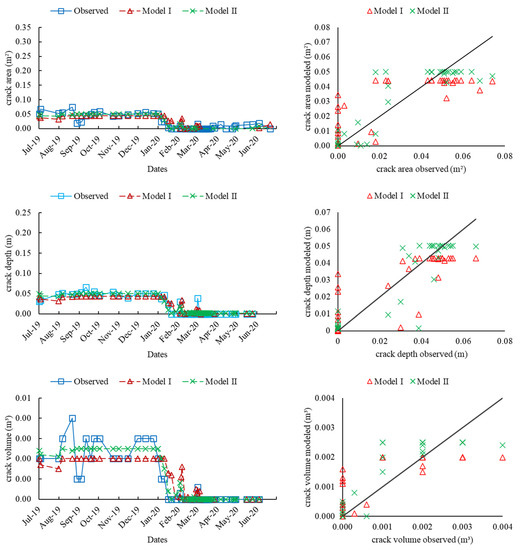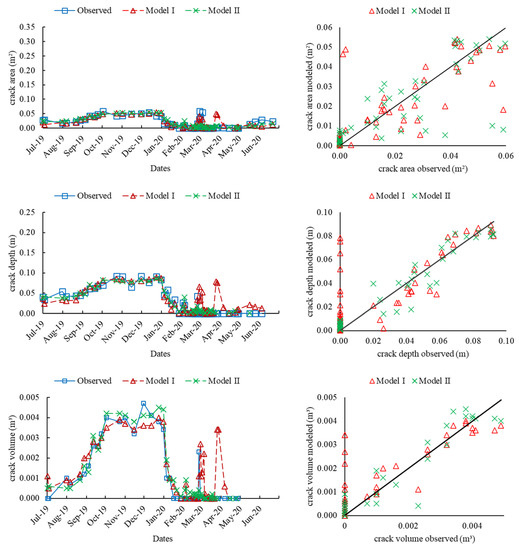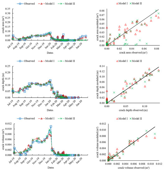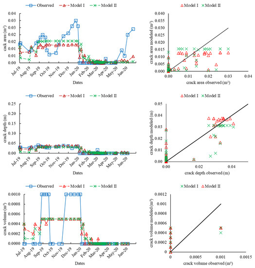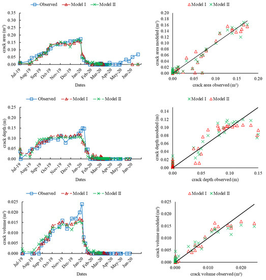 The estimates of the area of the cracks in the plots studied (Figure 5, Figure 6, Figure 7, Figure 8, Figure 9 and Figure 10) with both models showed lower dispersions than were observed in the field in Plots P1 and P5, which had the highest plasticity indexes. The swelling/shrinking processes can occur quickly in clay with a high plasticity index [4,28]; hence, a faster response to climate variations can also occur. The higher sand content in Plots P3 and P6 decreased water adsorption when compared to soils with higher clay content [5], decreasing the cohesion forces [28], with consequent distinct responses to climatic conditions when compared to plots with higher clay contents (Figure 5, Figure 6, Figure 7, Figure 8, Figure 9 and Figure 10). For the other plots (P2, P3, P4 and P6), there was greater dispersion of the models’ outputs when compared to the observed values. It is also noted that in Plot P4, Model II underestimated the observed values when compared to Model I output, suggesting an influence of clay content on model response.