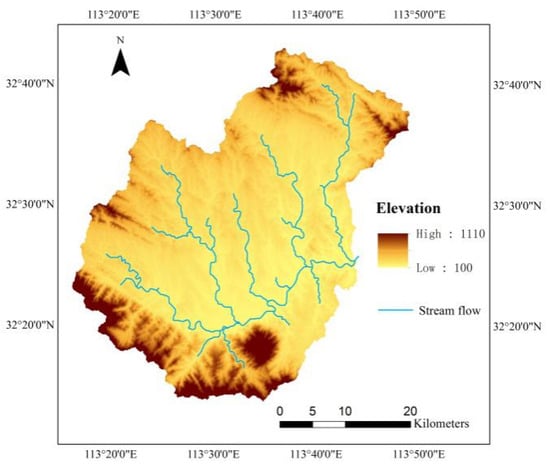 The DEM (Figure 1) was provided by the “National Science & Technology Infrastructure: National Earth System Science Data Sharing Infrastructure (http://www.geodata.cn/ accessed on 24 November 2019)”. It is worth noting that, the modeler should select fine resolution depending on the watershed size and level of accuracy required because more effort is required to prepare and calibrate the model [48]. Many studies have shown that, the optimal DEM resolution for flow and water quality simulation was 30–200 m, the resolution of the graphs in this study is 30 m [49,50,51].