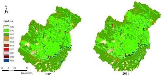 The soil data are derived from the soil property data of the harmonized world soil database (HWSD). The meteorological data, the measured data on runoff, and the sediment yield come from the Dapoling Hydrological Station. The data series is from 2005 to 2015. Land use data (Figure 2) were acquired by interpreting LandSat remote sensing images in 2005 and 2011. According to the land use type list in the SWAT model, ten land use types were classified and named as: AGRL(Agricultural Land-Generic), AGRC(Agricultural Land-Close-grown), FRST(Forest-Mixed), RNGB(Range-Brush), PAST(Pasture), RNGE(Range-Grasses), WATR(Water), URBN(Residential), URLD(Residential-Low Density), UIDU(Industrial). Then, the parameters of these land use types in the SWAT land cover database or SWAT urban database are loaded [52].