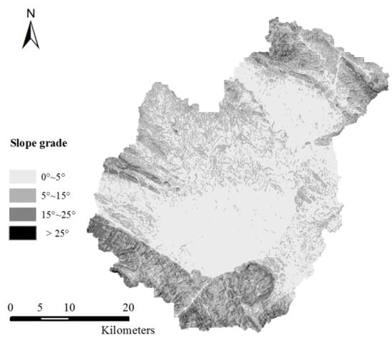 The SWAT-VRR model divides the study area into 33 sub-basins by DEM data, each sub-basin is divided into four slope grade zones (Figure 3) consisting of 0–5°, 5–15°, 15–25° and above 25°. When dividing the HRU, land use, soil and slope thresholds are set to 0%, 20%, and 0% respectively, so that all attributes of land use are taken into the calculation, while reducing the interference of fragmented soil patches. Respectively, SWAT-VRR resulted in a total of 473 HRUs comparing to 197 HRUs by the SWAT model, and the CN value of each HRU was recalculated in the SWAT-VRR model.