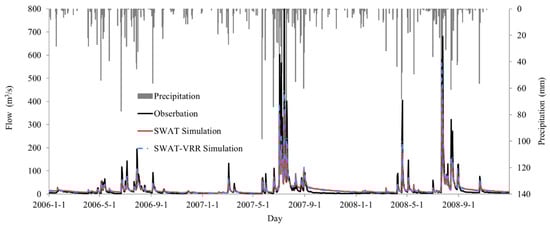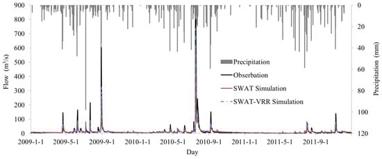 Figure 4 and Figure 5 display the daily runoff curves of simulation of the two models and observed data from 2006 to 2011, respectively (Figure 4 and Figure 5). As can be seen, the runoff curve of the SWAT-VRR model coincides more with the observed value than that of the SWAT model during the calibration and validation period. Compared with the flat SWAT runoff curve, the SWAT-VRR runoff curve has sharper fluctuations, which is more consistent with the observed data at different rainfall intensities. When the rainfall is small, the daily runoff simulation line of SWAT-VRR is slightly lower compared than that of the SWAT model, but the difference is not obvious; as the rainfall gradually increases, the runoff curve of the SWAT-VRR begins to level up and exceeds that of the SWAT model, which is closer to the observed value; in the case of heavy rainfall, the SWAT-VRR has a significantly higher daily runoff value than the SWAT model, which reflects that when the rainfall is very high, the effect of runoff regulation by forest is weak and produces more runoff. This also coincides with the actual flow routing process.