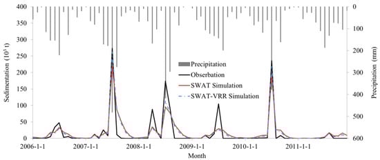 This trend is also manifested in monthly sediment yield simulation (Figure 6). SWAT-VRR does not differ much from the SWAT model in simulation effect during the dry season (from October to April), and the overall simulation value is slightly lower than that of the latter. However, the simulation effect of SWAT-VRR is significantly superior to the SWAT model in the rainy season (from May to September). In particular, when simulating several peak values, the sediment yield is significantly higher compared to the SWAT model and closer to the observed value. Consequently, compared with the SWAT model, the SWAT-VRR model improved simulation accuracy significantly, which more accurately reflect changes in the runoff generation and flow routing process caused by underlying surface changes, and thus more applicable for simulating changes in the water and sediment processes when the landscape pattern of the study area changes.