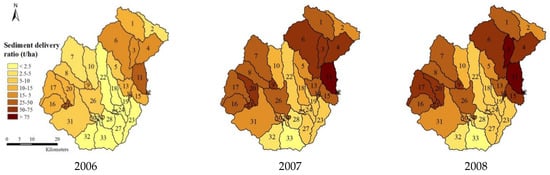 The SWAT-VRR model was used to simulate the sediment yield in each sub-basin from 2006 to 2011 (Figure 7 and Figure 8). Annual sediment yield varies greatly for different sub-basins where, each sub-basin had significantly higher sediment yield in 2007, 2008, and 2010 than in other years. One important reason is that the annual rainfall in these three years exceeded 1150 mm; while the rainfall in 2006, 2009, and 2011 was below 1000 mm, with significantly lower sub-basin sediment yield. The soil erosion in sub-basins 20 and 11 is relatively severe. In particular, sub-basin 11 has the highest sediment yield over the years. These sub-basins are mostly concentrated in the upper reaches of the main channel and the largest tributary. Sub-basins 23, 27, 28, 32 and 33 have relatively light erosion. In particular, sub-basin 33 has the lowest sediment yield over the years. Such sub-basins are mainly distributed in the middle reaches of the main channel.