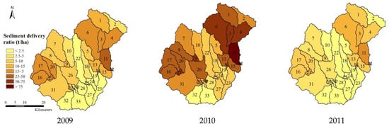 Yearly sediment delivery ratio of sub-basins during calibration period.