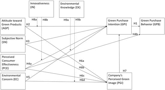 79], our findings proved that environmental concern directly and positively relates to green purchase intention. Therefore, apart from attitudes, subjective norms, and perceived behavioral control, environmental concern is an impactful predictor of consumers’ intention to purchase green products. Second, we found that the company’s perceived green image mediates main antecedents and green purchase intention. Moreover, a company’s perceived green image directly relates to green purchase intention, implying that it indirectly stimulates green purchase intention via the mediating role of purchase intention. While most previous studies examined the impact of a company’s green image on customers’ attitudes and behavior in the context of service providers such as restaurants, hotels, and airlines [