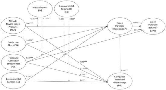 We used the latent moderated effect model to test the moderating effect of innovativeness (IN) and environmental knowledge (EK). To examine the moderating effect of innovativeness, we added the interaction term of attitude toward green products × innovativeness (AGP × IN) and perceived consumer effectiveness × innovativeness (AGP × IN) into the model. As illustrated in