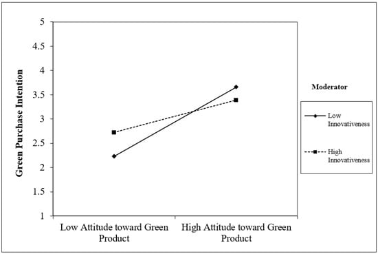 Figure 3 shows that the positive relationship between attitude toward green products and green purchase intention weakened when consumer innovativeness increased.