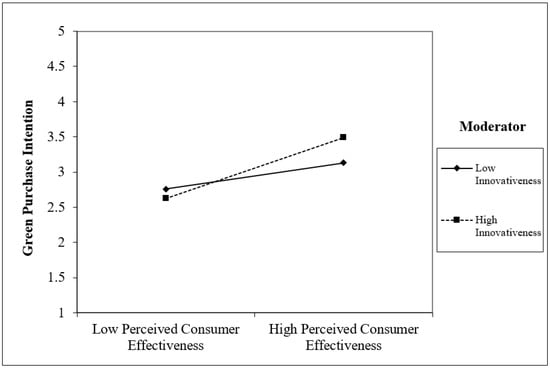 Figure 4 shows that the relationship between perceived consumer effectiveness and green purchase intention strengthened when consumer innovativeness increased.