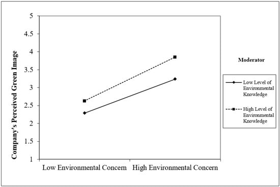 p > 0.05), therefore, H9a is not supported. However, environmental knowledge exerted a positive moderating effect on the relationship between environmental concerns and a company’s perceived green image (ß = 0.069, t = 2.013,