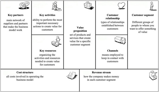 Osterwalder [12,31] developed a study evaluating and comparing the most common construction models in the literature, and on that basis identified the most frequently mentioned components. The result of this research consisted of a synthesis with nine building blocks, covering all components of the business models mentioned by at least two authors, excluding elements related to competitors.