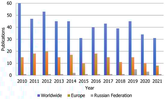 Even though the technologies based on the supercritical state of matter have found very broad application in various branches of human activity, they are just beginning to be introduced on an industrial scale in the oil and gas industry [11,12,13,14]. Figure 2 displays information retrieved from the SciVal database on the number of publications over the past 10 years devoted to the application of SCF-based technologies in the oil and gas industry for the topics and clusters: “Supercritical Carbon Dioxide; Fracturing Fluids; Thickeners”. As demonstrated, the average number of publications on this topic in the world is about 30 articles.