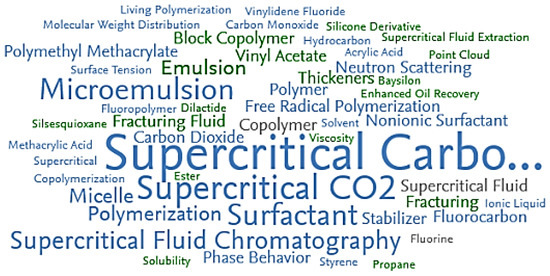 The tag cloud most commonly found in these publications, retrieved from the SciVal database, is presented in Figure 3. A review and analysis of the publications demonstrate that the possibility of using supercritical technologies to enhance individual technological processes of oil recovery is currently being actively studied. These studies also cover hydraulic fracturing [14,15,16,17], extraction of hard-to-recover oil reserves, high-viscosity oils [10,11,18], extraction of hydrocarbon compounds [19,20], and processing and neutralization of oil sludge [21].