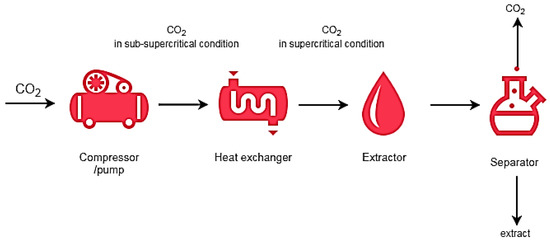 To date, there are two process diagrams for the extraction of carbon dioxide: using high-pressure pumps, and employing compressors. The generalized method of supercritical extraction using carbon dioxide includes condensation, extraction, and separation processes (Figure 4).