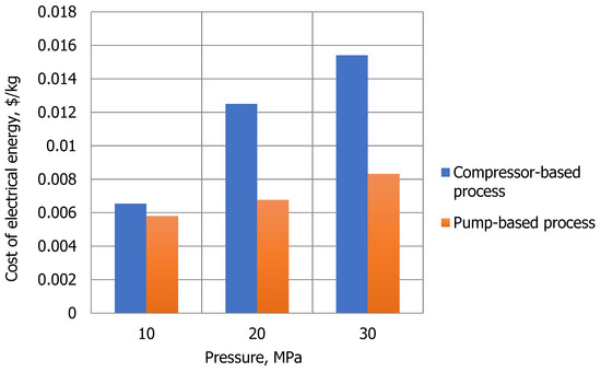 In works [51,52], it is noted that, in terms of the energy input, using a compressor is more expensive than using a pump. In the case of the pump, condensation has a greater impact, while in the case of the compressor, the electricity required to operate the compressor is more expensive (Figure 5). The pump will be cheaper than the compressor in terms of power consumption. At the same time, compressor systems do not require a low-temperature cooling medium (refrigeration unit), include less equipment, are less complex and easy to use, and also take up less space than pumping systems [53]. Notably, energy costs for compressor and pumping systems are almost the same at low pressures. Electricity costs for the compressor system will only increase with increasing pressure.