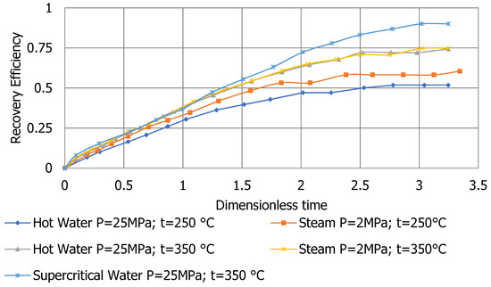In the article [18], experimental studies were conducted to compare the displacement of heavy oil by supercritical water, steam, and hot water. The dimensionless time was estimated as the ratio of the total volume of injected water to the pore volume of the active area. The results of the laboratory experiment have demonstrated that reservoir flooding with supercritical water has improved oil recovery by 17%, and reduced heat inputs by 34% compared to classical steam flooding (Figure 6).