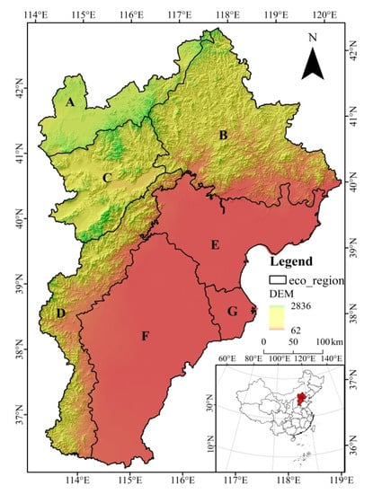 According to the ecological regionalization by the Research Center for Eco-Environmental Sciences, Chinese Academy of Sciences (http://www.ecosystem.csdb.cn accessed on 20 December 2020), combined with topography, hydrothermal condition, vegetation characteristics, and ecosystem structure of BTH, the study area is divided into seven ecological regions (Figure 1).