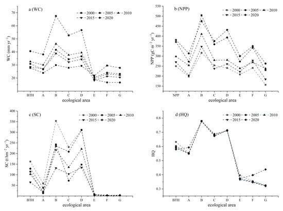 Temporal changes of ecosystem service in BTH and all ecological regions. (a) WC, (b) (NPP), (c) SC, (d) HQ.