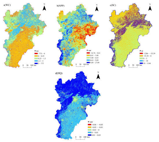 Spatial distribution of ecosystem service change rate from 2000 to 2020 in BTH (WC (a), NPP (b), SC (c), and HQ (d)), α represents the change rate of four ecosystem services, which is classified based on the natural partition point method. Red represents the very low change rate, yellow represents the low change rate, green represents the medium change rate, blue represents the fast change rate, and dark blue represents the very fast change rate.