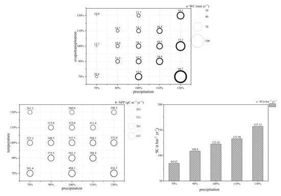 To diminish the impact of climatic anomaly in special years, the average climate state during 2010–2020 was set as the baseline. One must quantitatively evaluate the responses of WC, SC, and NPP to variation of 30% and 10% in precipitation and potential evaporation (Figure 4). Under the condition of constant potential evaporation, WC would increase 97.16% or decrease 66.73% with precipitation increase (decrease) 30%, and WC would increase 49.48% or decrease 28.02% with precipitation increase (decrease) 10%. Under the condition of constant precipitation, 30% increase (decrease) in potential evaporation would result in 27.4% decrease or 43.9% increase in WC, and 10% increase (decrease) in potential evaporation would lead to 10.5% decrease or 12.2% increase in WC. It can be seen that precipitation has a greater impact on WC than potential evaporation, and the change amplitude of WC caused by precipitation increase (potential evaporation decrease) was greater than that caused by precipitation decrease (potential evaporation increase), and the drastic change of precipitation presented greater impact on change amplitude of WC. Precipitation was also the main climate factor affecting soil conservation, and there was a very significant positive linear correlation between precipitation and SC (r = 1, p < 0.01). SC increased (decreased) by 36.13 t·hm−2 for every 10% increase (decrease) of precipitation. In addition, under the condition of constant precipitation, a 30% increase (decrease) in temperature could lead to an NPP decrease of 21.68% or increase of 13.04% and a 10% increase (decrease) in temperature would result in a 9.64% decrease or 6.63% increase in NPP. Under the condition of constant temperature, a 30% increase (decrease) in precipitation could cause NPP to increase 4.8% or decrease 8.4% and a 10% increase (decrease) in precipitation would result in a 1.8% decrease or 2.5% increase of NPP. The influence of temperature and precipitation on NPP is nonlinear, which was similar to the relationship between climate factors and WC. Meanwhile, the influence of temperature was greater than precipitation, and the decline of NPP caused by temperature rise (precipitation decrease) was greater than that caused by temperature fall (precipitation increase).