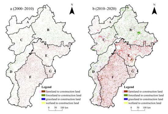 Spatial transition of land use during 2000–2010 (a) and 2010–2020 (b). (A) Bashang Plateau grassland and agro-ecological region; (B) Northern Hebei and Yanshan Mountain deciduous broad-leaved forest ecological region; (C) Forest agriculture and grass ecological region in the mountain basin of the upper reaches of Yongding River; (D) Taihang Mountain deciduous broad-leaved forest ecological region; (E) Beijing-Tianjin-Xiongan suburban agro-ecological region; (F) Central South Hebei plain agro-ecological region; (G) Yundong Binhai plain agro-ecological region.
