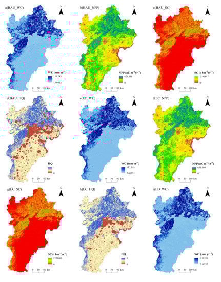 Figure 6 shows the variation of four kinds of ESs in BTH in 2030 under the scenarios of BAU, ED, and EC. The average WC in the base period (2010s) was 38.05 mm, and WC in 2030 under three scenarios was more than 50 mm. Especially in the ecological protection situation, WC reached 55.83 mm, with an increase of 46.7% compared with the 2010s. From the perspective of spatial variation, WC in Region B and D with high vegetation coverage increased the most, with the rate of 35.84 mm and 30.57 mm, respectively, in EC scenario. Under the BAU scenario, WC in Region F and G with great impact of human activities was slightly lower than that in the 2010s. Compared with the 2010s, NPP also showed an increasing trend in 2030 under the three scenarios, with an increase range of 5.16–5.94%, and land use change had little impact on NPP. Spatially, NPP of Region C and A in the northwest of BTH increased most significantly, with an increase of 12% and 17%, respectively, indicating that ecological engineering in Bashang Plateau and the upper reaches of Yongding River had achieved remarkable results. Compared with the base period, SC in 2030 would reduce around 2%, and simulation results under the three scenarios presented little difference. Region F and G distributed in North China Plain, with more than 99% of the areas having the slope of less than 2°, and the SC was extremely low (2.30–2.54 t·hm−2 year−1), which would increase slightly by 3.1–4.6% in 2030. In addition, SC in the other five ecological regions decreased, especially in Yanshan-Taihang Mountain area (Region C and D). Forestland and grassland greatly reduced and the SC decreased significantly, with a rate of 4.6–5.4 t·hm−2 year−1 (1.8–3.2%) under the three scenarios. The HQ in 2030 is 2.6–11.5% lower than that in 2010s under the three scenarios, and the ecological environment is seriously degraded. As a direct reflection of the transformation between ecological land and construction land, HQ is significantly affected by human activities. In Region E, where urbanization degree was the highest, construction land accounted for more than 50%, and HQ decreased significantly, with a reduced rate of 0.11 (30.89%), especially under the ED scenario. However, in Region F, where farmland accounted for more than 70%, even if ecological land (forest land and grassland) was less than 10%, the HQ still increased by 13.49% (0.05) due to the reduction of construction land under the EC scenario.