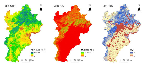 As an integral part of nature, ecosystem services can be used as an intermediate factor to connect ecosystem with human welfare, which has direct value to human and society, so as to bridge the differences between ecosystem and economic issues. Referring to related research [], this study comprehensively considers international classification of ecosystem service [], key detection indicators monitored by local governments, the difficulty of indicators evaluation and the close relationship with human beings [], and habitat quality (HQ), soil conservation (SC), water conservation (WC), and net plant productivity (NPP) are selected as the key evaluation indicators. The InVEST model and CASA model have been widely used in ecosystem service assessment due to their advantages of simple parameter setting and good applicability [,,]. In the current study, HQ, SC, and WC were quantified by InVEST model, and NPP was simulated by CASA model, the computational methods of parameters are shown in Table 2, and the specific calculation formula of the model is detailed in Supplementary Information.