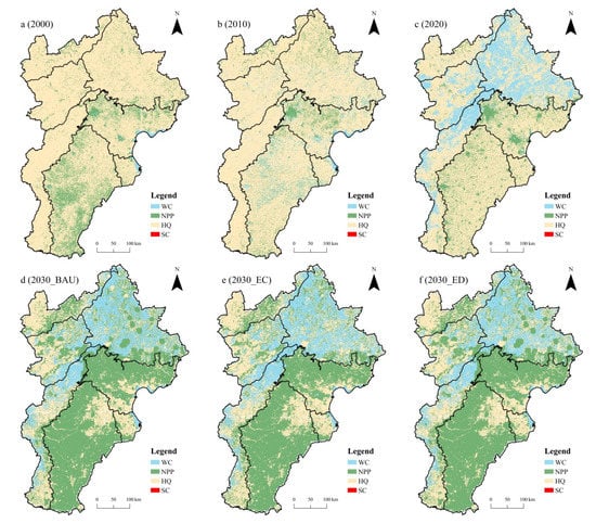 Spatial distribution of primary ecosystem services hotspots in BTH in 2000 (a), 2010 (b), 2020 (c), 2030_BAU (d), 2030_EC (e), 2030_ED (f).