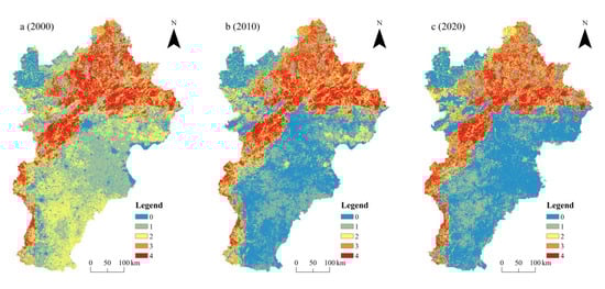 Hotspot analysis is a proven technique to identify the region where the value that is of high interest occurs [,]. In this study, the grid whose ecosystem service exceeded the respective average values of all grids was defined as the hotspots of this kind of ecosystem service, and the multiple ecosystem services hotspots in BTH were obtained by overlaying the hotspots of four ecosystem services. If the grids did not exceed their corresponding mean values, these raster cells were defined as non-hot area. If the raster cell had only one ecosystem service above the average, then this type of raster was defined as class 1 hotspot. Based on this, Class 2, 3, and 4 hotspots were defined respectively, and the spatial distribution pattern of multiple ecosystem service hot spots was finally obtained [,].