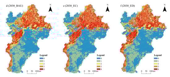 Spatial distribution of multiple ecosystem services hotspots in BTH in 2000 (a), 2010 (b), 2020 (c), 2030_BAU (d), 2030_EC (e), 2030_ED (f).