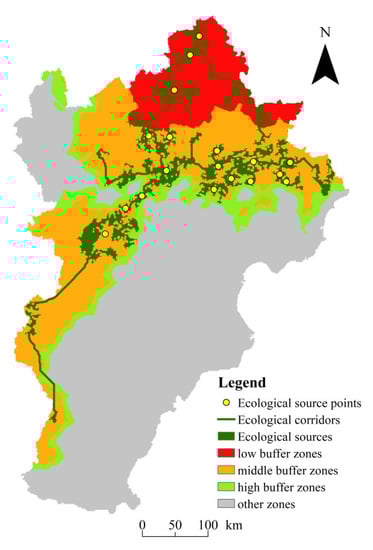 A reasonable and orderly spatial pattern of ecological security plays an important role in maintaining ecosystem integrity, strengthening ecosystem spatial distribution pattern, and realizing ecological harmonious development []. The concept of ecological security based on maintaining the sustainable development of ecological process has gradually attracted extensive attention from the government and academia []. Multiple models have emerged to evaluate the ecological security pattern, such as circuit theory, overed weighted averaging (OWA), minimum cumulative resistance model (MCR), and so on [,,]. At present, the method of using the minimum resistance model to determine the ecological source, establish the resistance surface, and then judge the security pattern proposed by Yu has become the main model for ecological security pattern construction and has been successfully applied to many regions, e.g., in northeast China and Guizhou Province [,,]. In addition, ecosystem services are also added to the index system to build the ecological security pattern, Wang et al. used the priority and spatial richness indexes of ecosystem services to reconstruct the ecosystem services in Ganzhou and constructed ecological security patterns of different levels based on the reconstructed ecosystem services [].