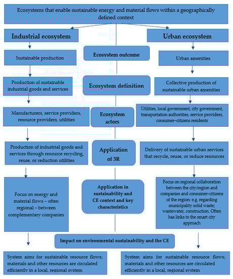 According to the authors [], a circular industrial ecosystem is “a regional community of hierarchically independent, yet interdependent heterogeneous set of actors who sustainably produce industrial goods and services in symbiotic collaboration and resource use.” A comparative analysis of industrial and urban ecosystems is presented in Figure 2.