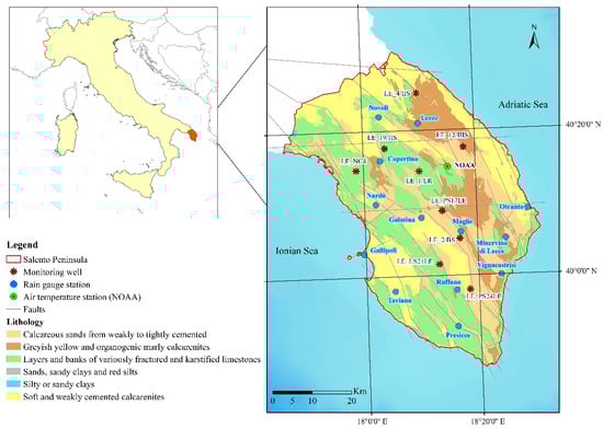 Lithology and tectonic features of the Salento Peninsula with location of the monitoring wells and rain gauge and air temperature stations.