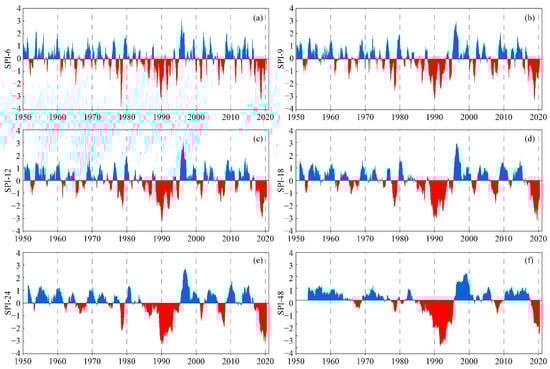 Temporal evolution of SPI at the representative time scales of (a) 6-months, (b) 9-months, (c) 12-months, (d) 18-months, (e) 24-months, and (f) 48-months for the Lecce rain gauge station from 1951 to 2020. The year marks are centred on 1st July of each year.