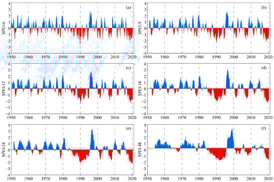 Temporal evolution of SPEI at the representative time scales of (a) 6-months, (b) 9-months, (c) 12-months, (d) 18-months, (e) 24-months, and (f) 48-months in the Lecce rain gauge station from 1951 to 2020. The year marks are centred on 1st July of each year.