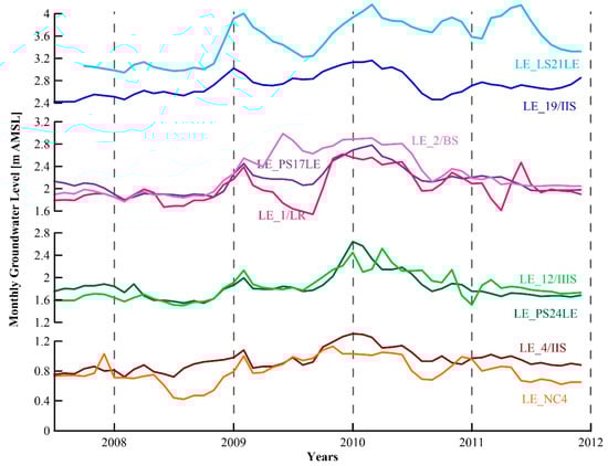 Monthly GWL time series from July 2007 to December 2011 of the nine monitoring wells. GWLs are reported in m AMSL. The year marks are centred on 1st July of each year.
