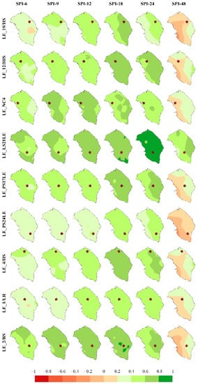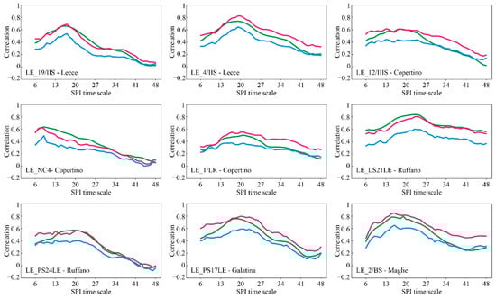 Figure 9 shows the spatial distribution of correlations between the GWL series for each well and the SPI series computed at 6, 9, 12, 24, and 48 months for all rain gauges using ordinary kriging. This analysis revealed that, in general, all GWLs display a positive correlation with most of the meteorological stations in Salento. Moreover, the recharge processes of the Salento aquifer depend on precipitation over broader areas so long as all the considered wells, except LE_NC4, showed a high or moderate correlation with the SPI 18-months, not within specific limited areas.