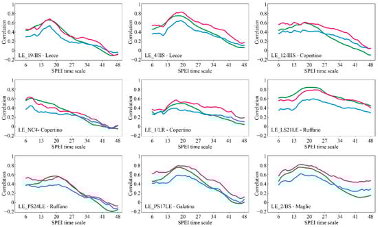 Correlation coefficients between GWLs and the corresponding SPI from 6- to 48-months calculated with Pearson’s (green lines), Kendall’s (blue lines), and Spearman’s (purple lines) methods.