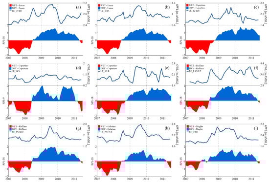 GWLs and the corresponding more correlated SPI for (a) LE_19/IIS–Lecce, (b) LE_4/IIS–Lecce, (c) LE_12/IIIS–Copertino, (d) LE_NC4–Copertino, (e) LE_1/LR–Copertino, (f) LE_LS21LE–Ruffano, (g) LE_PS24LE–Ruffano, (h) LE_PS17LE–Galatina, (i) LE_2/BS–Maglie. The year marks are centred on 1st July of each year.