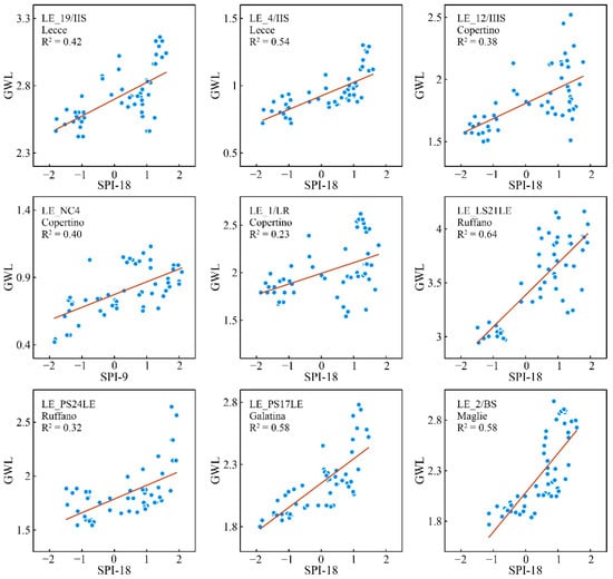 Scatterplots and R-squared between GWLs and the corresponding SPI for the more correlated time scale (18 months for all monitoring wells except 9-months for LE-NC4).