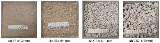 Four fractions (0/2 mm, 0/4 mm, 4/10 and 8/20) of RCA, designated FR1, FR2, CR1 and CR2, respectively, were used for concrete production (see Figure 2). The 8/20 mm fraction was produced mixing the fractions 8/14 mm 50% and 14/20 mm 50%. The recycled aggregates were characterised following EN 12620 “Aggregates for concrete” specifications.