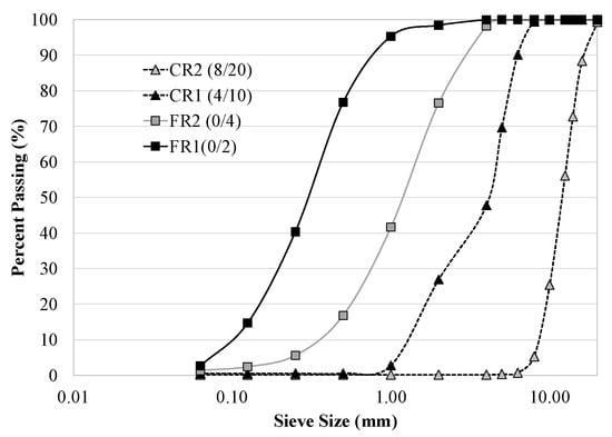 The grading distribution of the four fractions of recycled aggregates 0/2 (FR1), 0/4 (FR2), 4/10 (CR1) and 8/20 (CR2) are shown in Figure 3. They were determined following EN 933-1 specification. According to the grading distribution, the fine fractions (FR1 and FR2) were categorised as Gf85. The 4/10 gravel fraction was classified as Gc90/15 and the 8/20 fraction as Gc85/20, the categories being highlighted by the Spanish concrete Structural Code [].