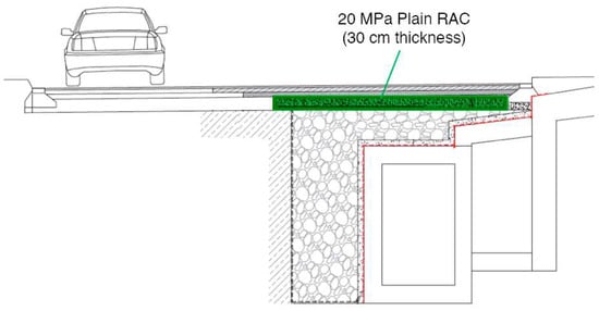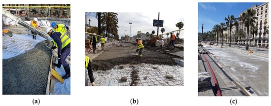 In May 2021, a 500 m long pavement-base layer with a 30-cm thickness (highlighted in green in Figure 4) in Passeig de Colom (PC) in Barcelona, Spain was constructed. Plain concrete with a minimum of 20 MPa compressive strength was manufactured using FR1, FR2, CR1 and CR2 fractions. In addition, more than 815 m3 of washed recycled aggregates were employed in pavement-base layer construction.