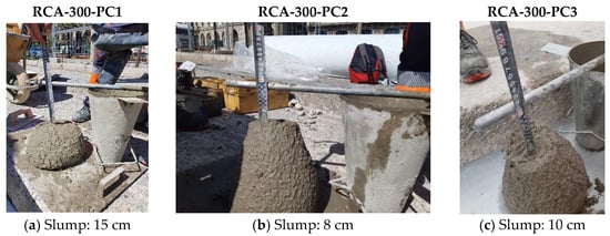 Figure 5 shows the slump values for the three concrete mixtures produced. All concrete included 1% S and 1% P in the production process. The recycling plant and concrete producer were located 25 km from Barcelona. However, heavy morning traffic at the entrance to Barcelona caused huge delays. Under those conditions, the trip could take up to 50 min. When the truck arrived, all the concrete mixtures had a slump lower than 5 cm. Consequently, to increase the concrete workability, it was necessary to add 0.20% S to the concrete mixture. After mixing the concrete for 10 min, slump values of 15 cm, 8 cm and 10 cm were determined for the RCA-300-PC1, PCA-300-PC2, and RCA-300-PC3 concretes, respectively (Figure 5). The RCA-300-PC1 was produced with the highest water/cement ratio, achieving the highest slump. The PCA-300-PC2 and RCA-300-PC3 concretes were made with a similar effective w/c ratio and reached a similar adequate slump value.