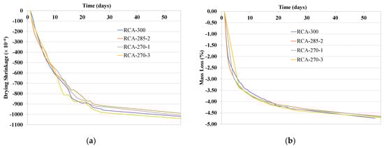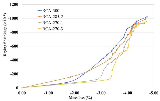 Figure 8 shows the relationship between weight loss % and shrinkage value of the four concretes. The concrete RCA-270-1 and RCA-270-3 produced with the highest volume of recycled aggregates suffered a higher mass loss with very low shrinkage value. In addition the RCA-270-3, produced with the highest total w/c ratio, suffered more than 3% mass loss with a shrinkage value of −120 µɛ. However, all the concretes achieved similar last shrinkage and total mass loss (%) values.