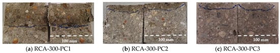 According to the Structural Code, the maximum and average water penetration depth under pressure should be 5 cm and 3 cm, respectively. However, the RCA-300-PC1 reached a higher penetration depth than the code required (see Table 8 and Figure 9a–c) caused by a concrete mixture with a water/cement ratio that was too high. The other two concretes, RCA-300-PC2 and RCA-300-PC3, employed in all the pavements volume except the first casting, achieved adequate properties in concretes for structural code requirements. However, this concrete was designed as a pavement-base layer (non-structural element). Consequently, it did not need to achieve the requirements of structural concrete.