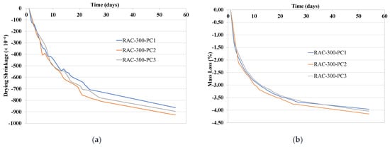 (a) drying shrinkage (×10−6) and (b) mass loss (%) of the concrete samples.